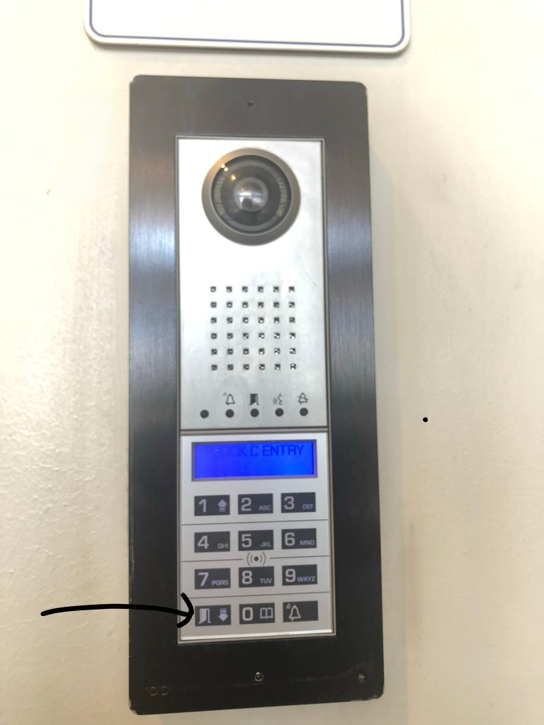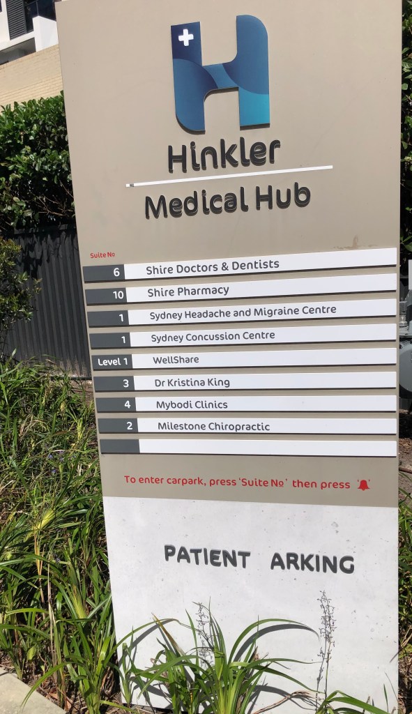 Train: 15 min walk from Caringbah Railway Station. Access is via the first entry on the left at 416 Kingsway. (There are stickers on the pillars and path to show you the Hinkler Medical entry). Push open the metallic gate (doesnt lock) and enter the following code to open the glass door: DOOR BUTTON (bottom left, marked on the picture here with an arrow) – 1985 – DOOR BUTTON. Catch the Hinkler Medical Patient Lift to Level 1.